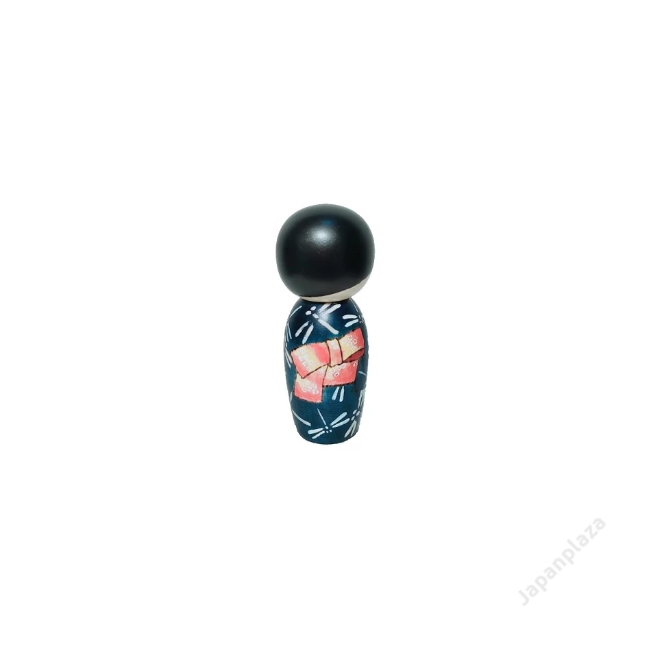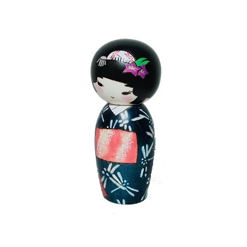 Akikaze – Jesenný vánok - 15 cm - Dielo majsterky Izumi. Ttmavomodré kimono bábiky s motívom vážok evokuje jesenné chladné stmievanie, vo vlasoch má tradičnú ozdobnú ihlicu. Majsterka Izumi je známa používaním tradičných japonských farieb a jemných línií.